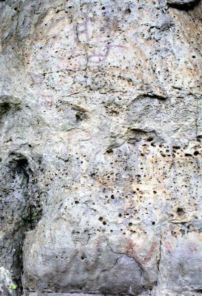 Цвет изображений красный. Все изображения сильно повреждены отслаиванием корки, на которую они были нанесены. Более или менее неплохую сохранность имеет фигура, напоминающая копытное животное, и дугообразные линии с отростками. Остальные фигуры настолько фрагментарны, что не поддаются восстановлению.